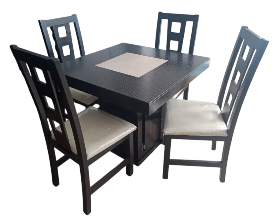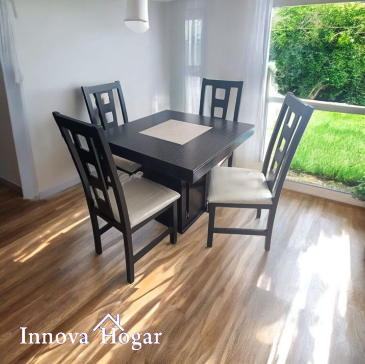 Este comedor de estilo contemporáneo, está fabricado con cubierta de madera industrial y acabado fino. Es ideal para una familia pequeña, ya que incluye cuatro sillas de madera de pino con asientos tapizados en vinil, muy bien acojinados con hule espuma.