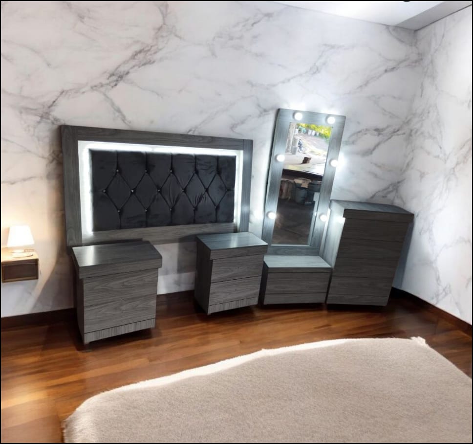 Complemento ideal para tu recámara, nuestra cabecera matrimonial con iluminación Led genera una personalidad propia, calidad y diseño elegante dará vida a tu recámara ofreciendo comodidad inigualable. Incluye 5 piezas Cabecera matrimonial, 2 buroes con alajeros, una comoda con compartimento secreto y una luna con iluminación tipo Vanity.